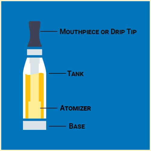 Place au clearomiseur, le choix de la simplicité et de l’efficacité. Ce réservoir transparent (en plastique ou en verre) accueille une résistance préfabriquée, facilement remplaçable. Une structure en quatre éléments compose la plupart des clearomiseurs :