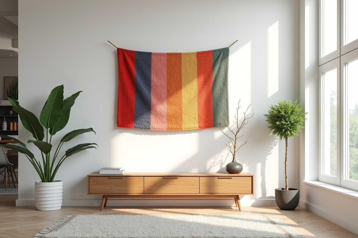 L’intérêt du tricotin ? Sa capacité à épouser tous les styles : scandinave, rétro ou pop, il s’adapte, se transforme, s’harmonise. Sur un mur immaculé, osez la couleur vive pour une touche graphique ; dans un univers déjà chatoyant, préférez les nuances en camaïeu pour une ambiance enveloppante.